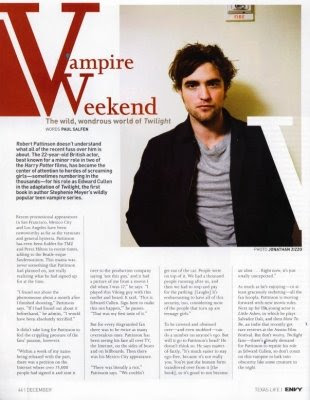 Robert Pattinson, o actor que interpretava Cedric Diggory na série HP e que participou também em Crepúsculo, apareceu recentemente em 2 revistas: a Spirit Magazine e a Envy Magazine. Podes ver as imagens em baixo, respectivamente.